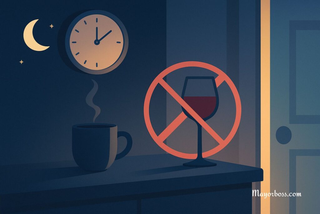 Caffeine and alcohol push your kidneys to make more urine. They also irritate the bladder and disrupt sleep. Common evening sources include coffee, tea, cola, energy drinks, hot cocoa, and chocolate. Even “decaf” can contain some caffeine.