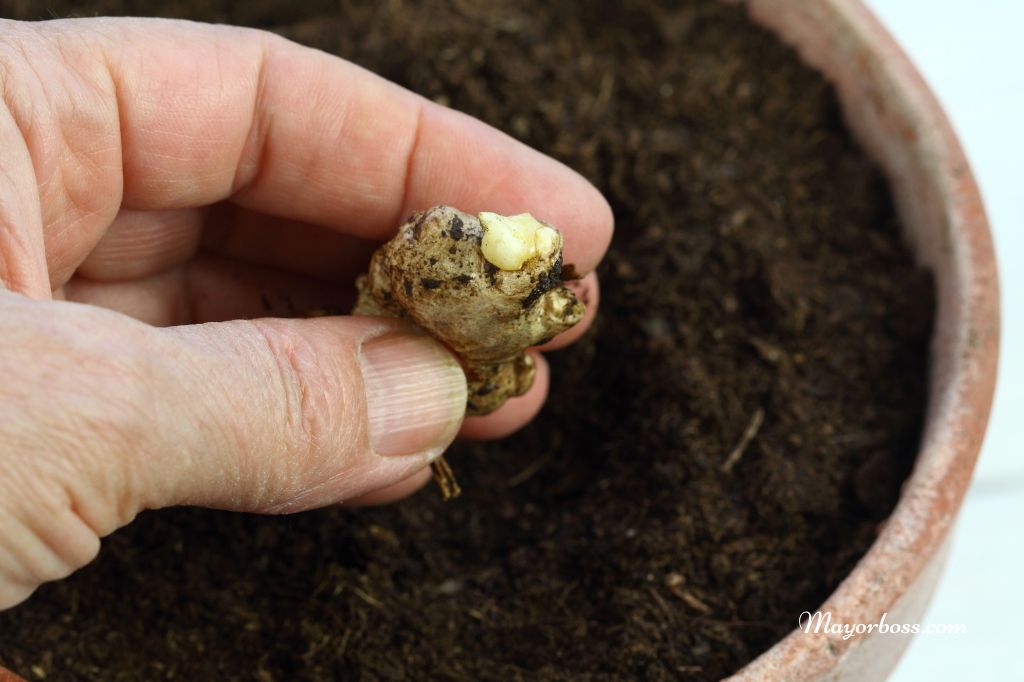 Use loose, rich soil mixed with compost. Ginger spreads sideways, so use a wide container rather than a deep, narrow one if planting in pots.