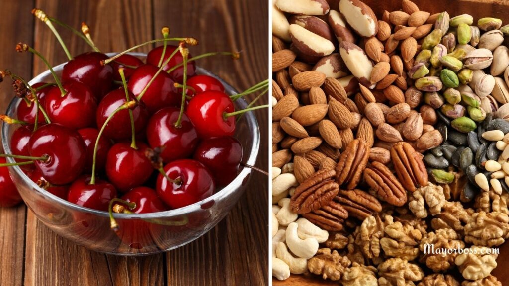 Tart cherries may support sleep because they contain natural melatonin and other helpful compounds. Nuts add protein, healthy fats, and minerals that help keep you satisfied.